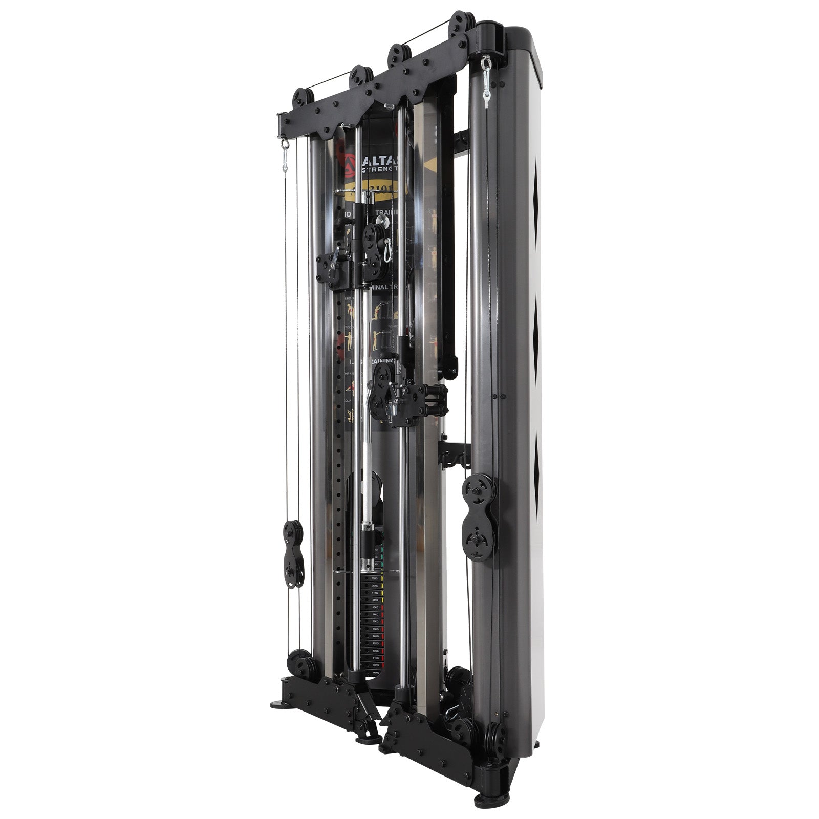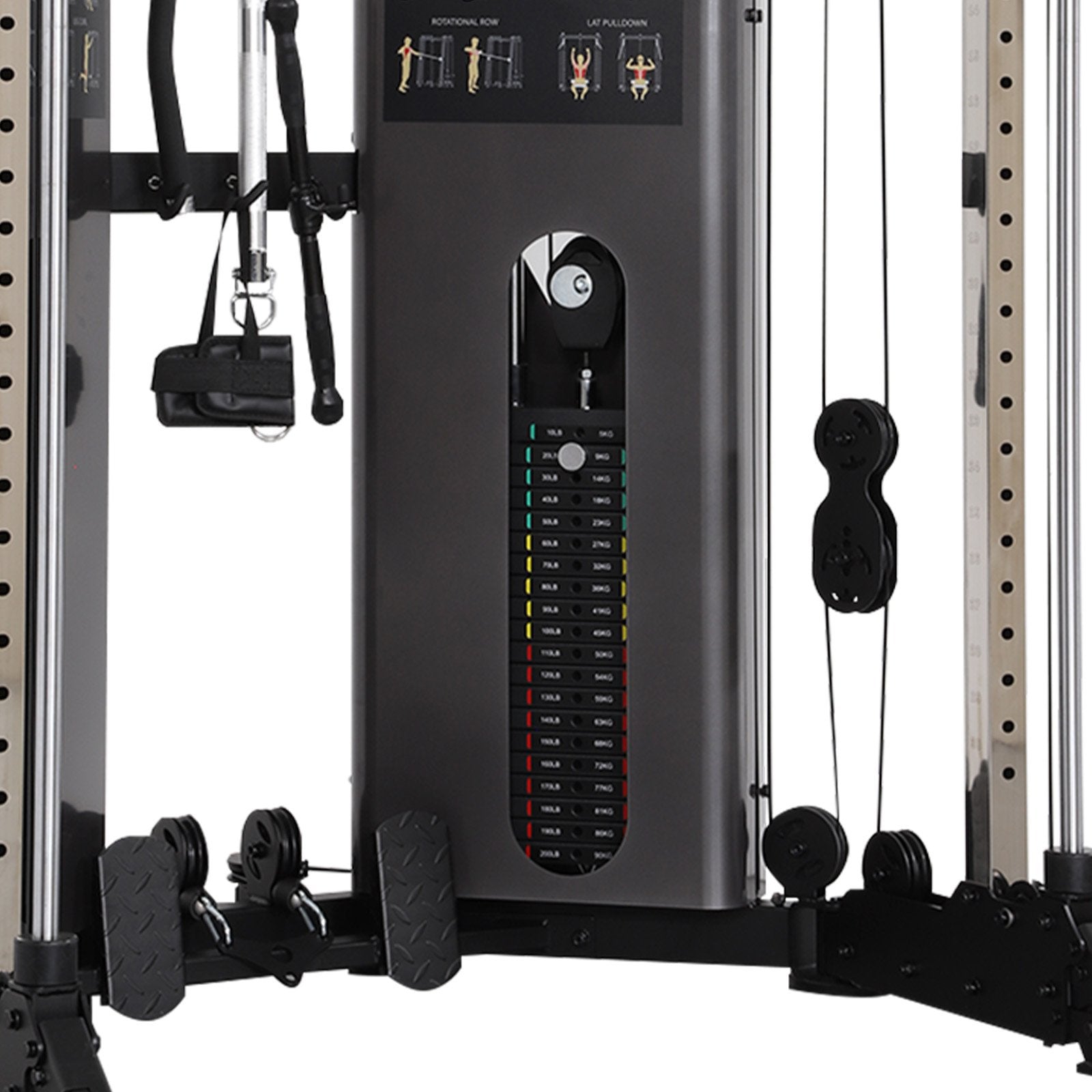 Engineered with space in mind can transform from a depth of 54” to as little as 22” in less than 30 seconds. without compromising exercise function. The AL-3101 combines a power rack. functional trainer. smith machine. dip station. chin-up station. core trainer. low row. and leg press into one compact multi-station machine!