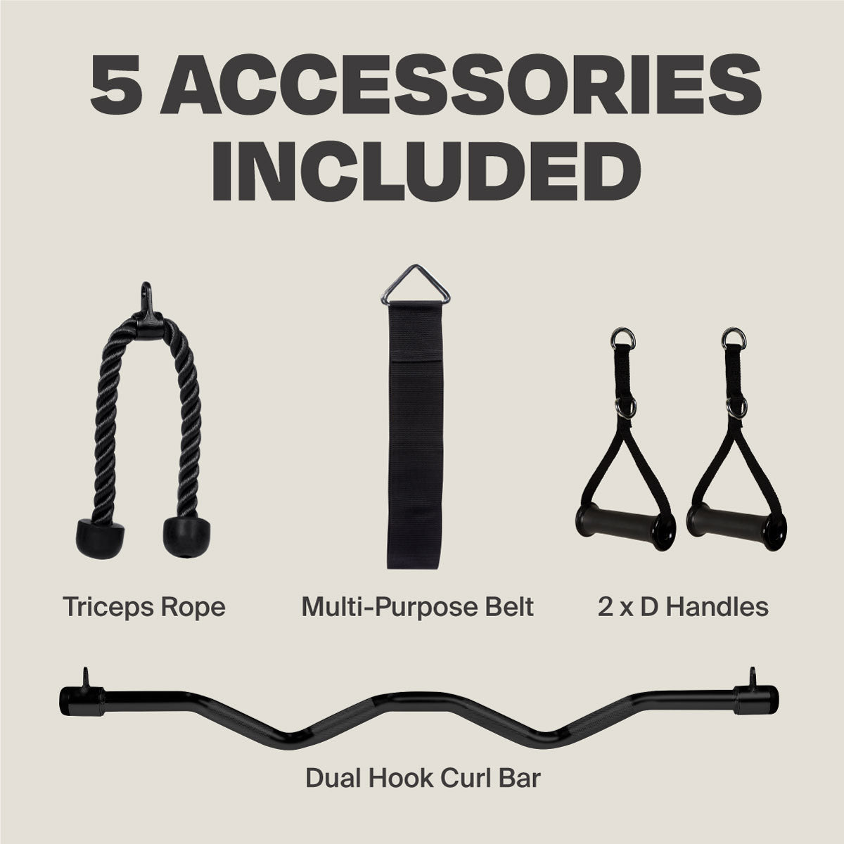- 5-piece accessory kit: D-handles (×2). dual-hook curl bar. chin/dip belt. triceps rope