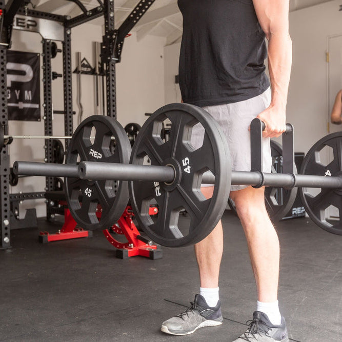 The urethane-coated Equalizer™ plates are REP's premium iron plates. built for durability and performance. The commercial-grade urethane coating protects equipment. reduces noise. and is highly impact-resistant and odor-free. Six precision-cut grip holes make them easy to handle and versatile for individual plate exercises. Finished with a de-bossed logo. white weight markings. and a 3% weight tolerance. these plates fit all Olympic 2” barbells.