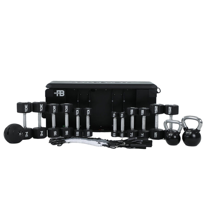 Includes 5. 10. 15. 20. 25. 30lb dumbbells. 18lb and 30lb kettlebells. 15lb slamball. 10. 20. 40lb resistance band sets. handles. and ankle straps.
