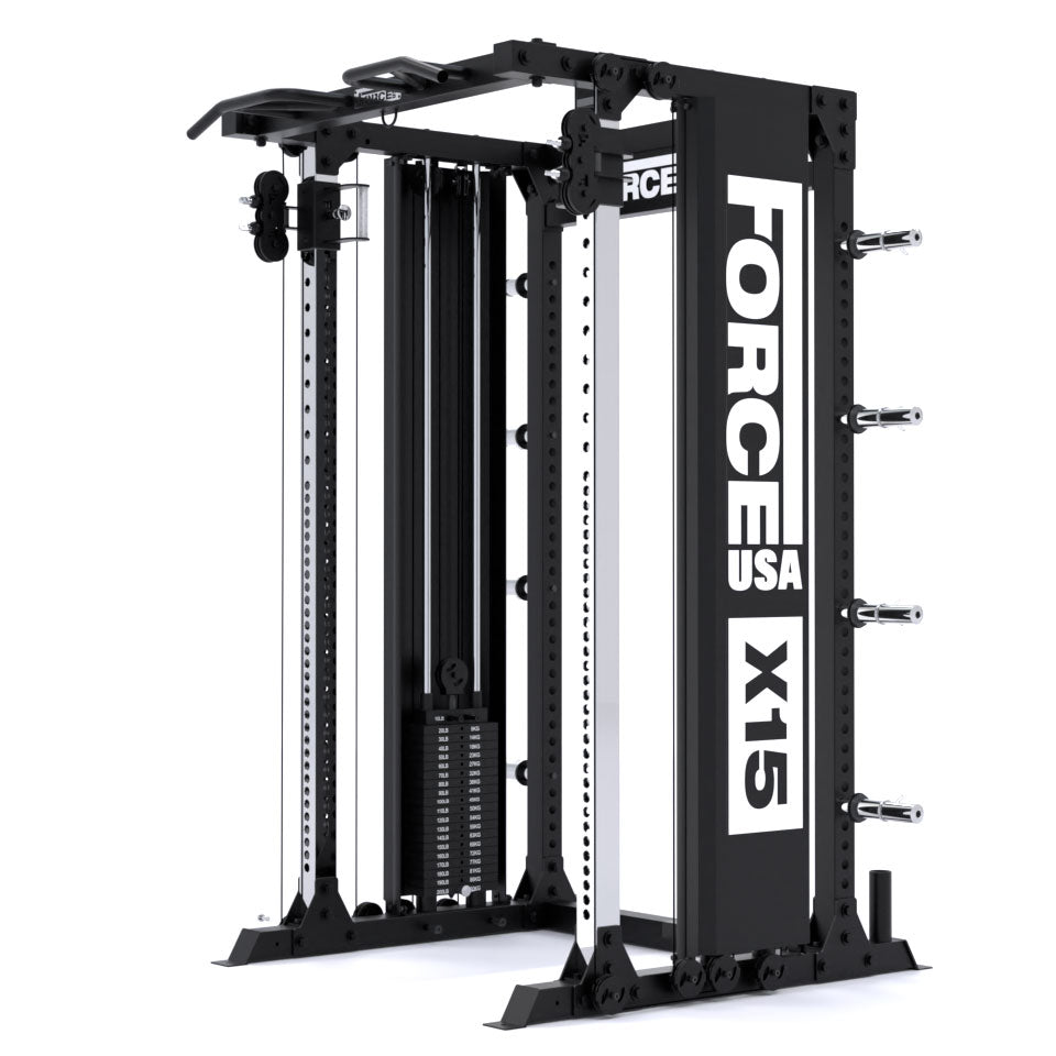 The pin and plate-loaded Force USA X15 Pro base unit includes six strength training machines. 15 attachments. and over 400 exercise possibilities combined into one professional-grade home gym system.